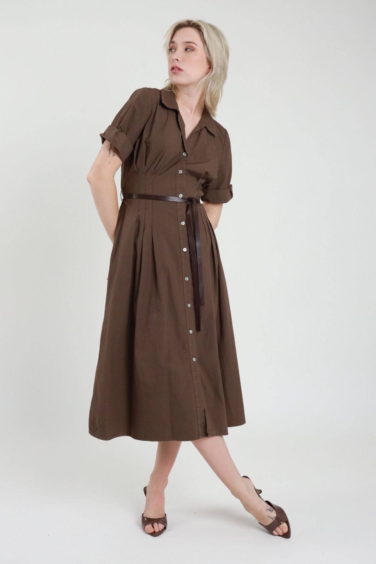Abito Midi in Cotone con Mezze Maniche, Chiusura Bottoni Frontale con Colletto, Ripresa in Vita con Elastico e Sotto il Seno, Cintura in Ecopelle.