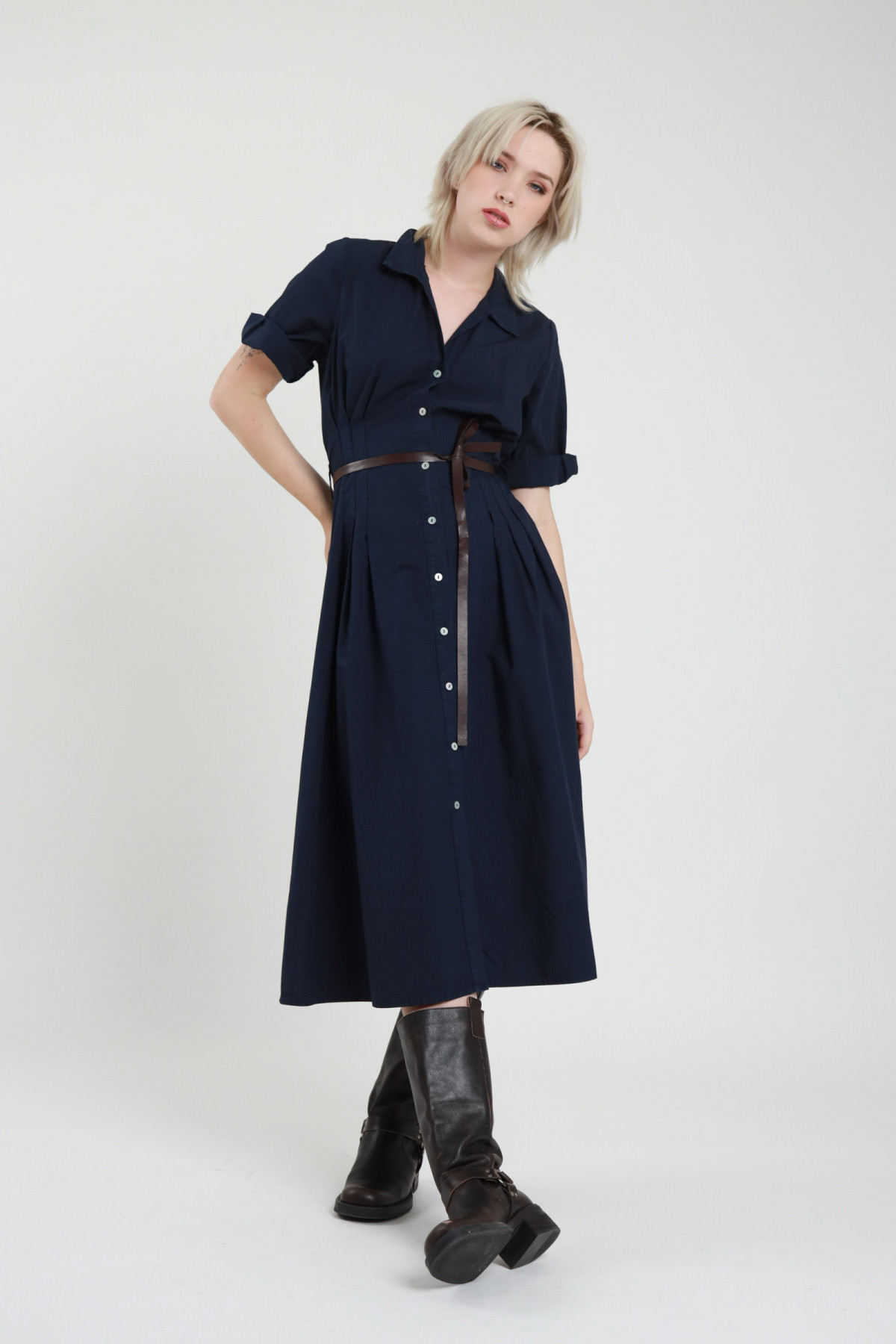 Midikleid aus Baumwolle mit halben Ärmeln, Knopfverschluss vorne mit Kragen, Raffung in der Taille mit Gummizug und unter der Brust, Gürtel aus Kunstleder. 100 % co