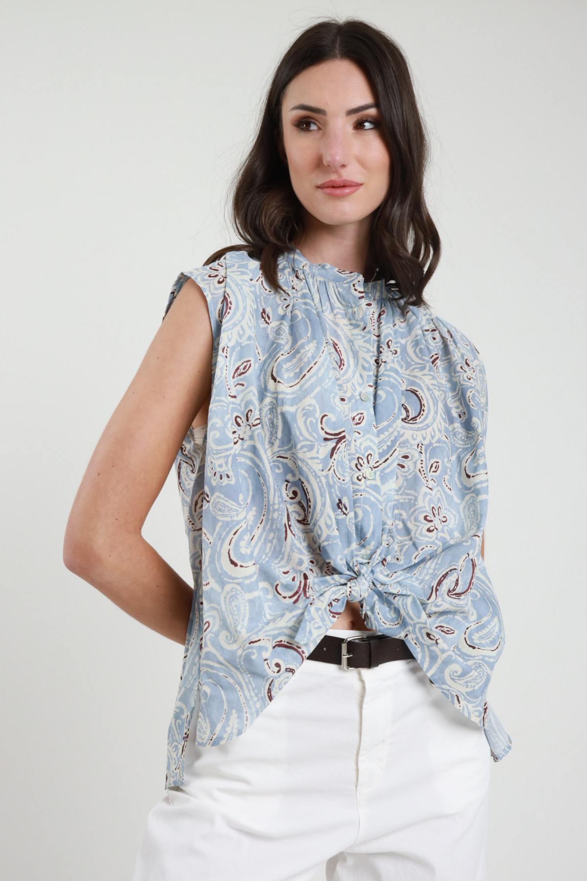 Camicia Smanicata in Fantasia Check con Bottoncini sul Fronte e Nodo sul Fondo.