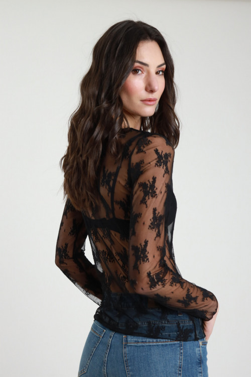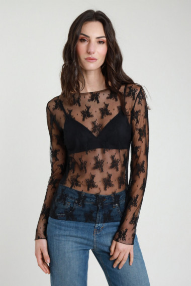 Stretch-T-Shirt mit langen Ärmeln und Rundhalsausschnitt aus Spitze. 89 % pa 11 % ea