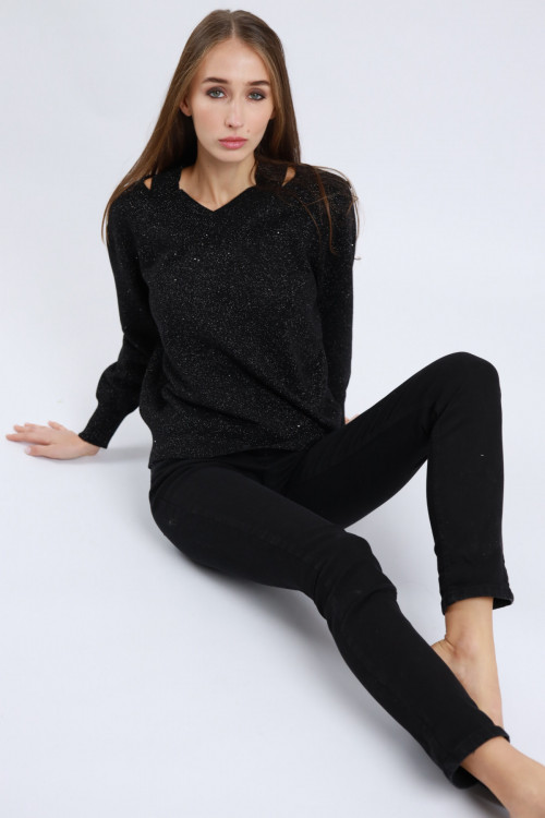 Cu-out-Hemd in Lurex-Ausschnitt V und Mikro-Paillettenanwendungen. 35%PA 33%VI 32%PA