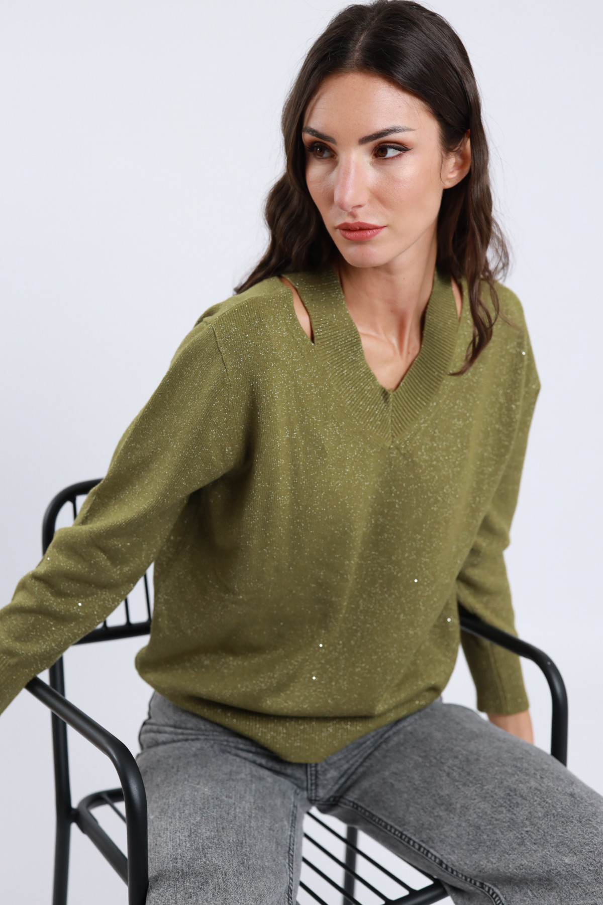 Cu-out-Hemd in Lurex-Ausschnitt V und Mikro-Paillettenanwendungen. 35%PA 33%VI 32%PA