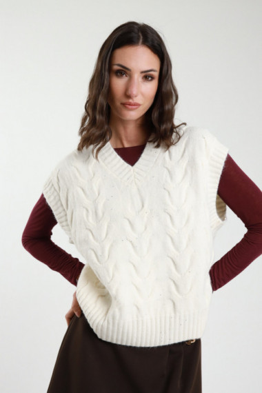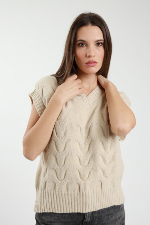 Weste mit V-Ausschnitt, Zöpfen und Mikropailletten. 43 % pro Stück, 30 % pro Jahr, 27 % pro Jahr