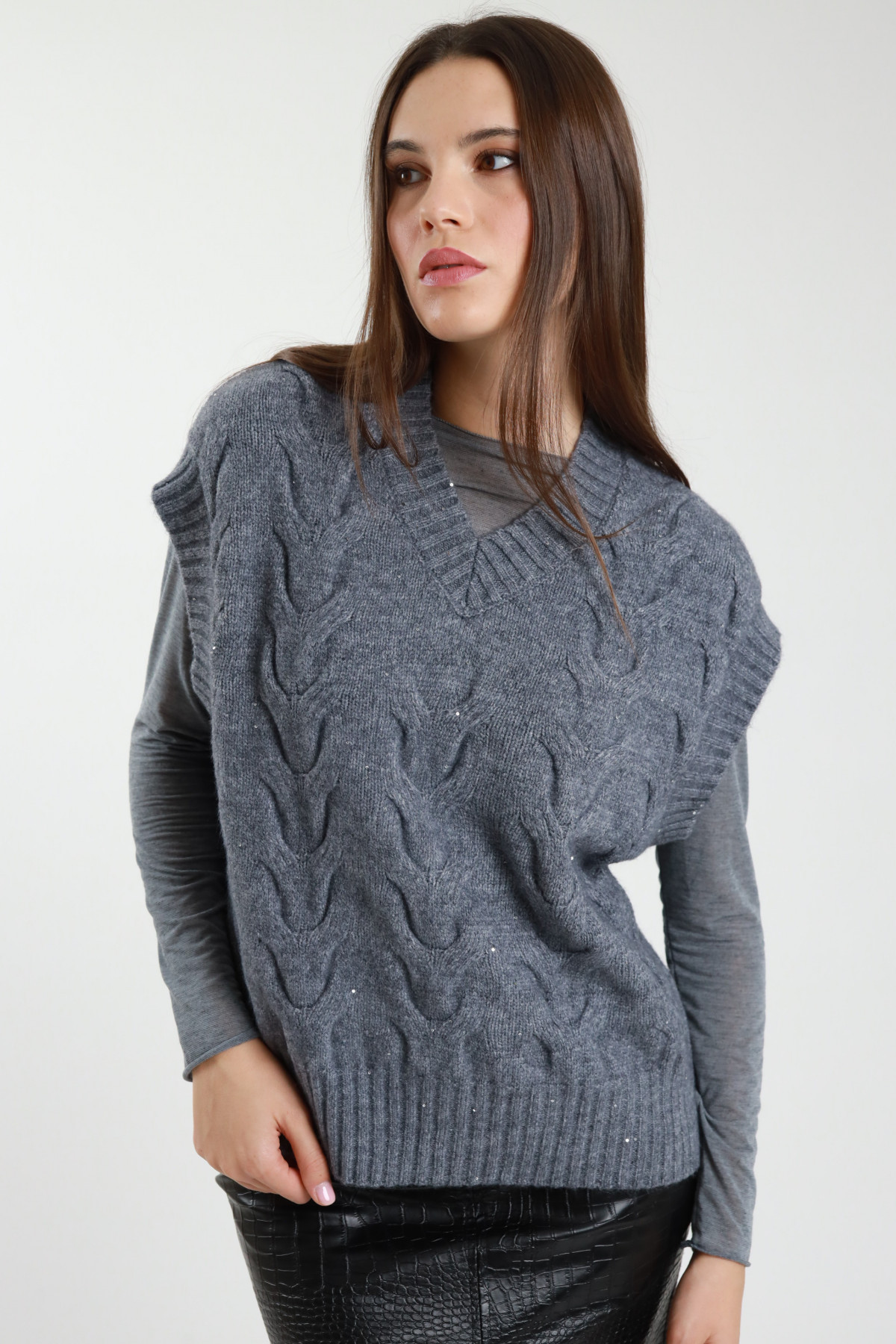 Weste mit V-Ausschnitt, Zöpfen und Mikropailletten. 43 % pro Stück, 30 % pro Jahr, 27 % pro Jahr