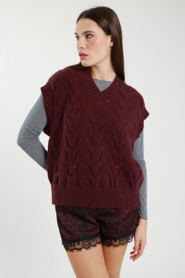 Weste mit V-Ausschnitt, Zöpfen und Mikropailletten. 43 % pro Stück, 30 % pro Jahr, 27 % pro Jahr