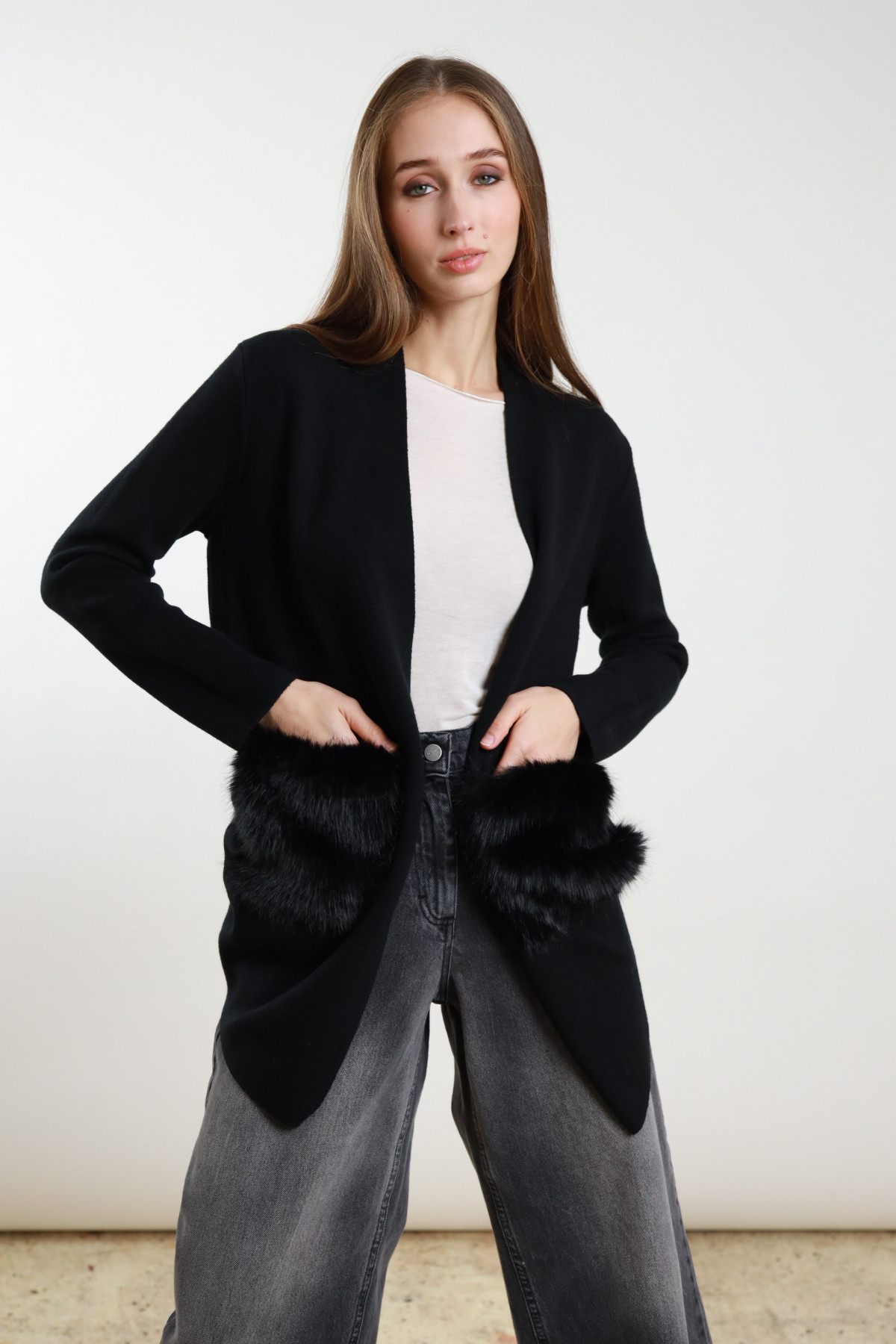 Strickjacke ohne Verschluss mit Vordertaschen aus Ökofell. 50 % vi 28 % pl 22 % ny