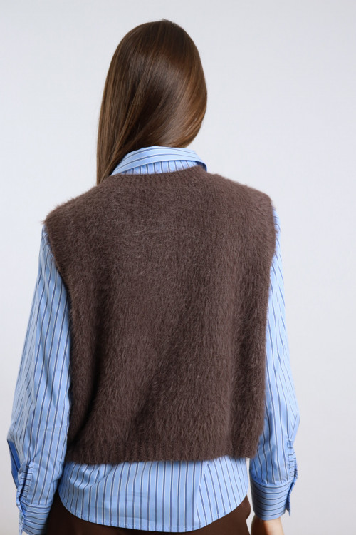 Over vest closing with buttons. Fringes on the bottom and back in crochet. 66%VI 30%PL 4%ea