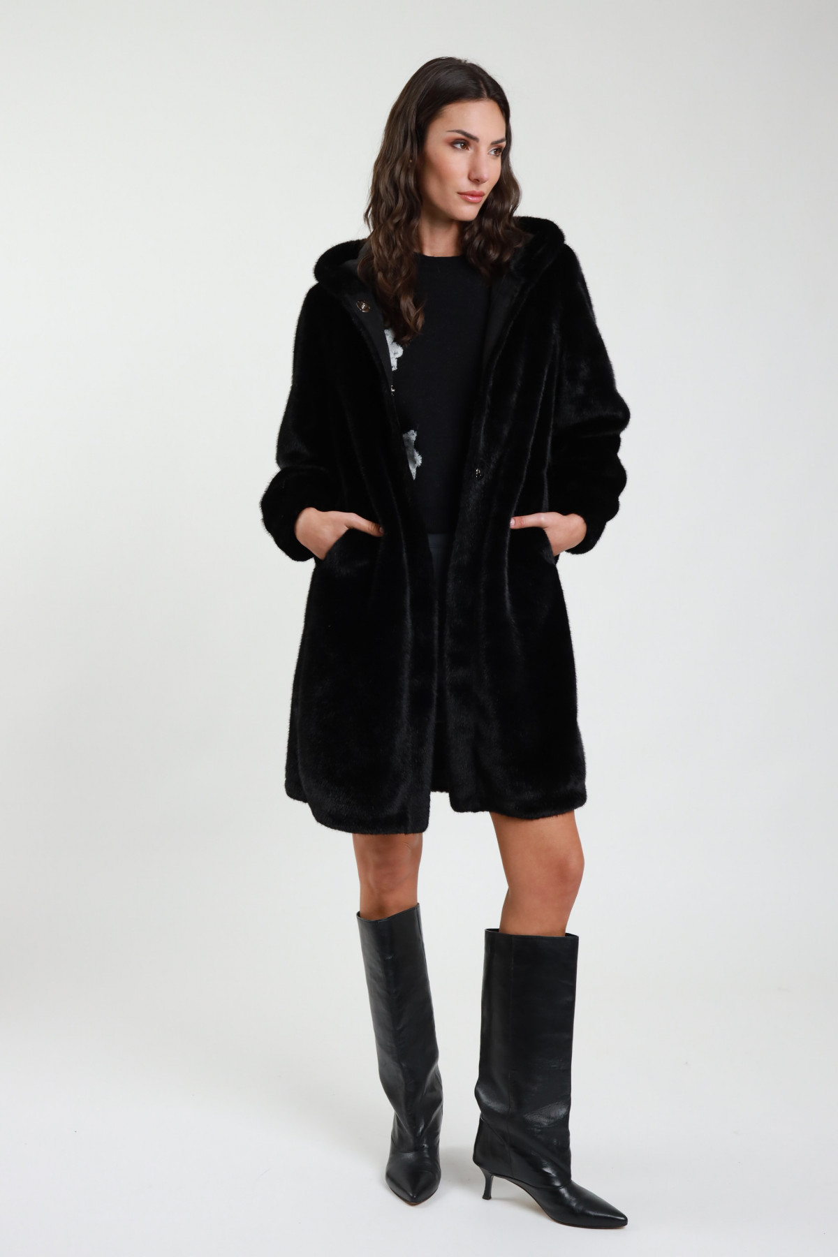 Ecopelliccia Lunga Con Zip Frontale e Cappuccio.