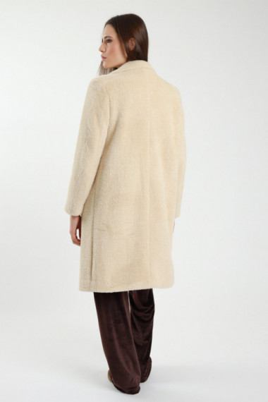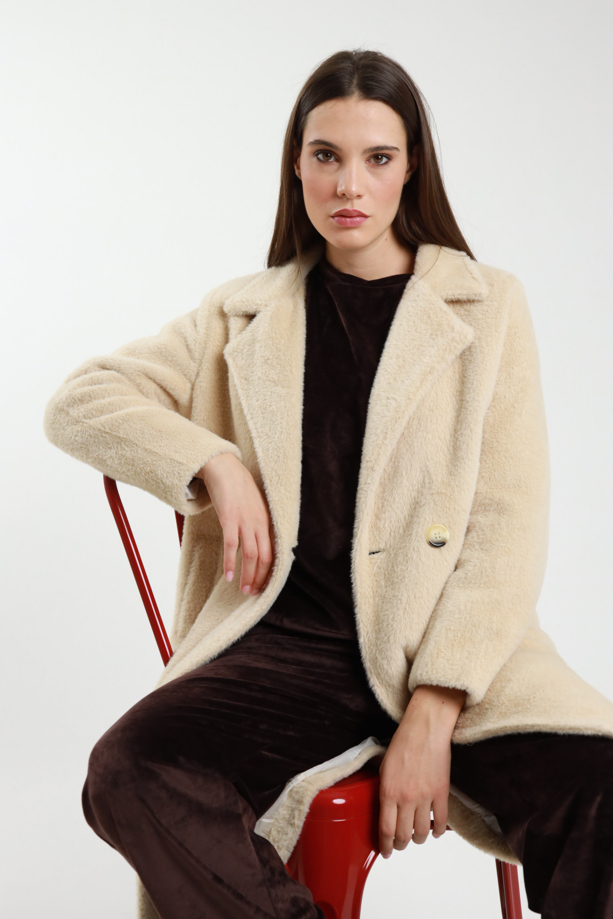Einreihiger Kunstfellpullover mit klassischem Revers, Ein-Knopf-Verschluss und Seitentaschen. 100%pl