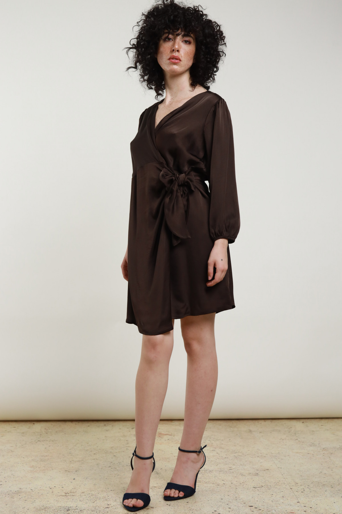 Viscose satin dress with V -neckline and lace closure with crossroads. 100%VI
