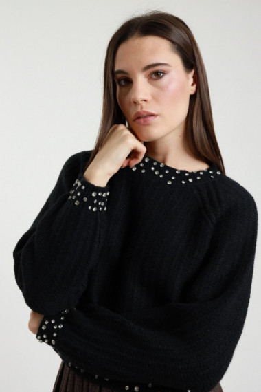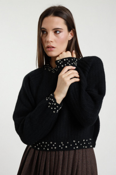 Maglia Girocollo con Maniche Traforate in Crochet e Orli a Costine.