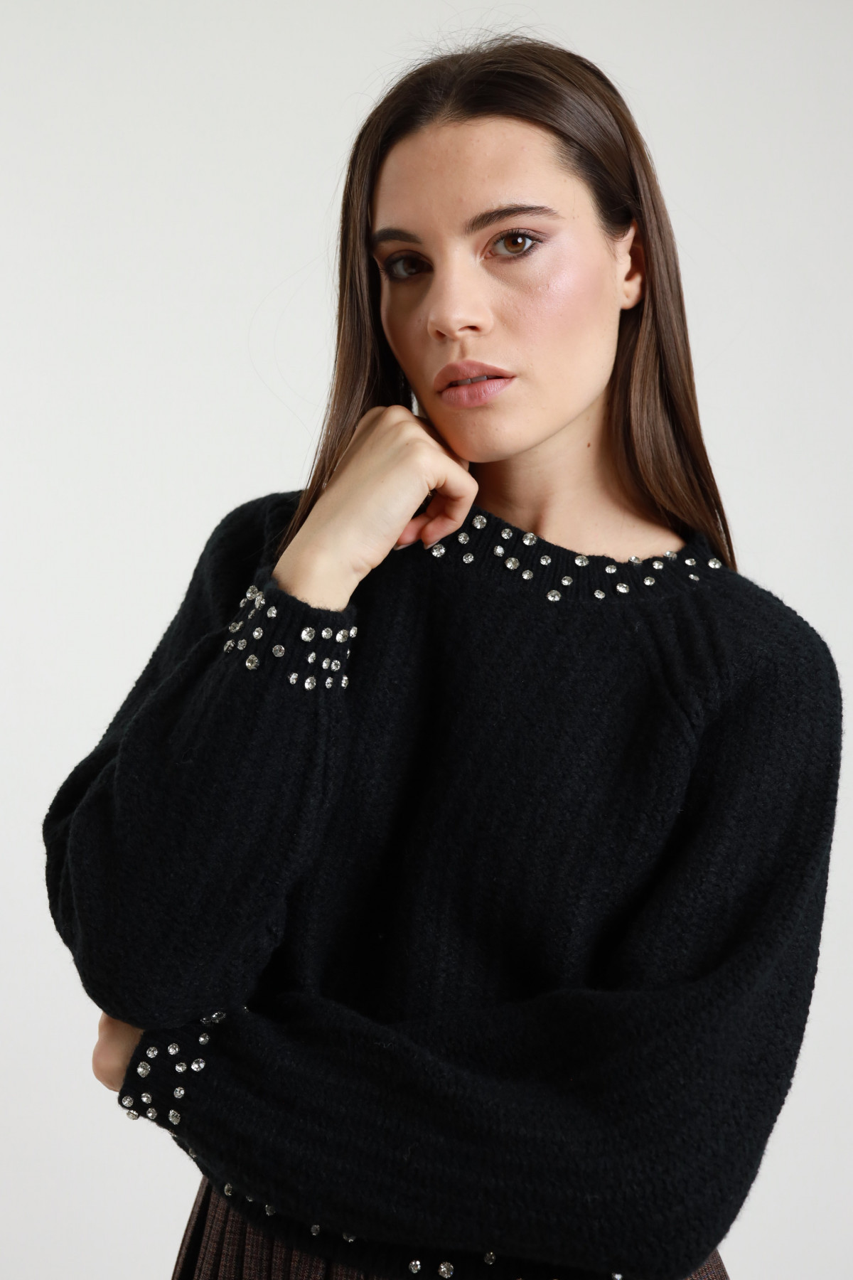 Maglione Girocollo con Maniche a Palloncino Bicolor e Fondo a Contrasto.
