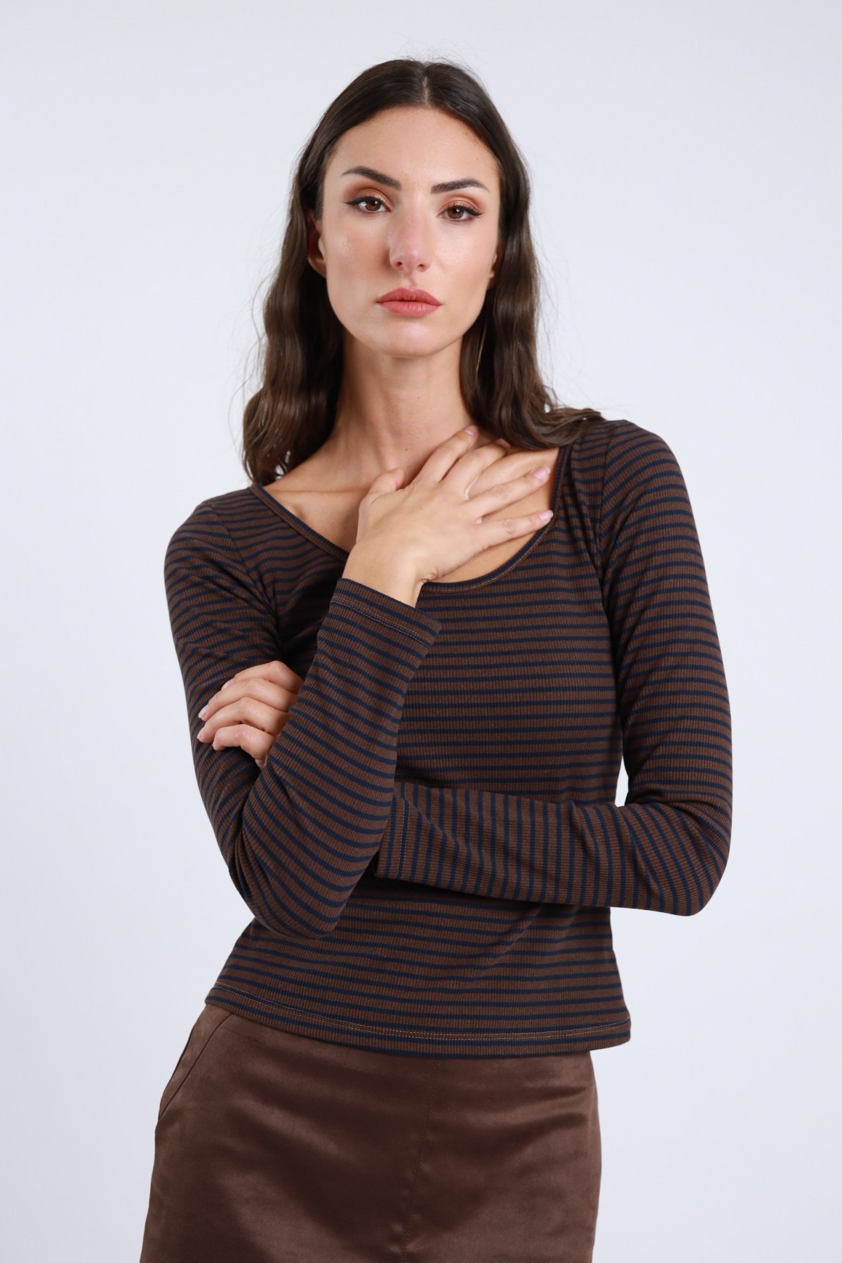 T-shirt Righe a Maniche Lunghe Girocollo con Ricamo Stelle.