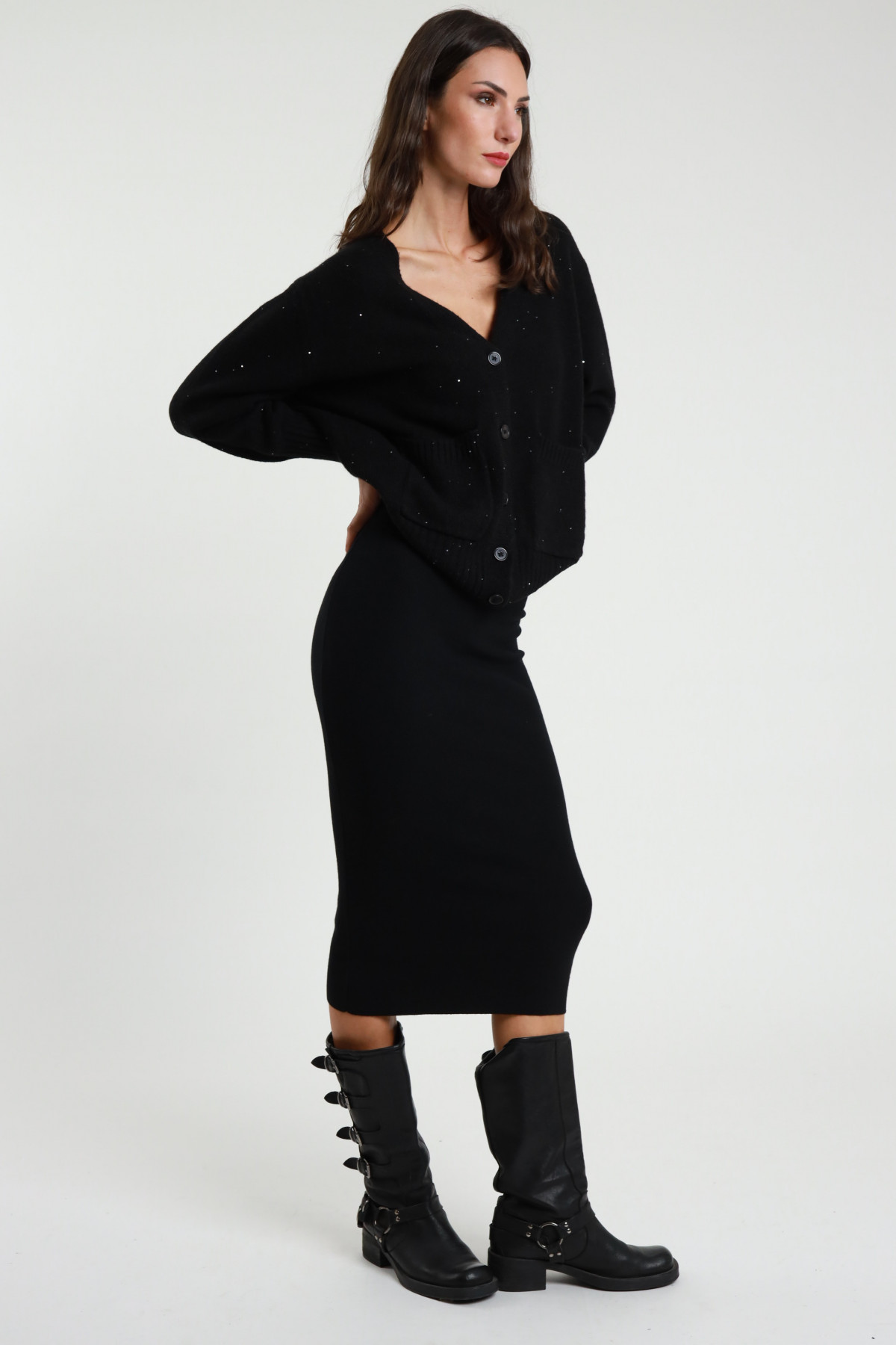 Longuette -Rock mit gerader Linie, Länge unter dem Knie und elastisch im Leben. 50%VI 28%PL 22%NY