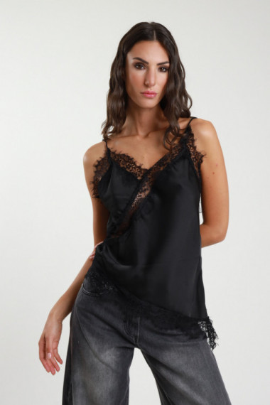 Top Crop Smanicato in Doppio Tessuto, Pizzo sul Davanti.