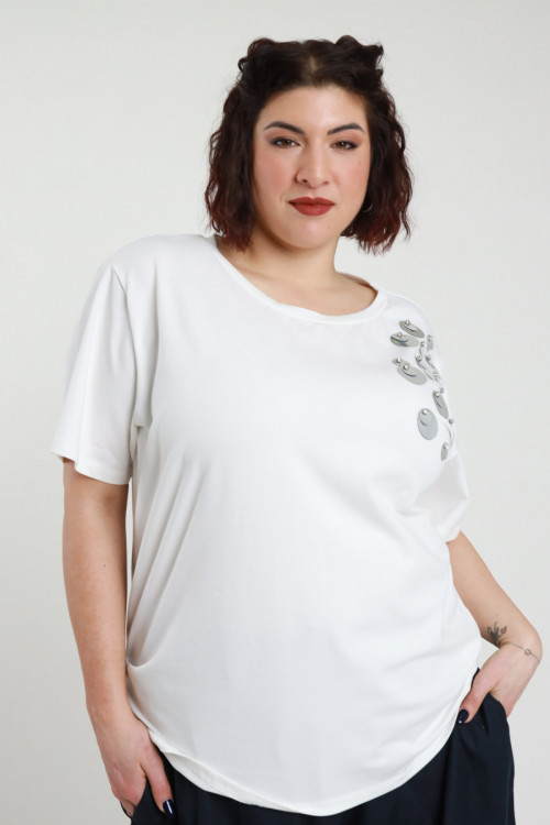 T-Shirt aus Stretch-Baumwolle mit Makro-Pailletten-Detail an der Seite – Curvy Susy Star Line. 94 % CO 6 % Stück