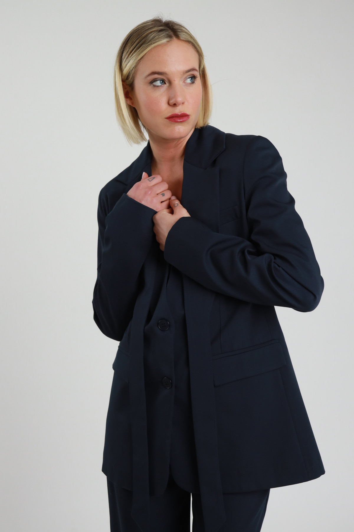 Blazer Rever mit Schnürsenkeln, zwei Knöpfen, tailliert. 78%pl 18%vi 4%ea+100%pl