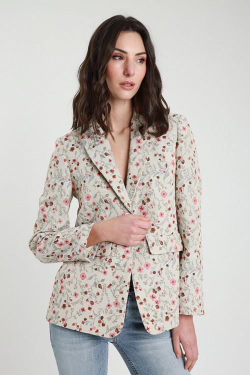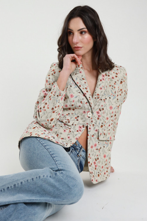 Jacke mit einem Knopf, Blumenmuster und aufgesetzten Taschen. 100%pl+76%pl 13%co 5%ac 4%af 2%wo