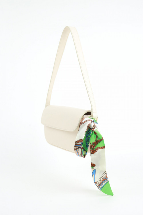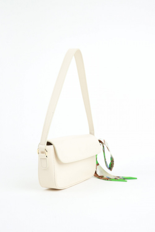 Baguette-Umhängetasche mit Klappe und Clip-Knopfverschluss, abnehmbarem Schal-Detail. 100 % PU