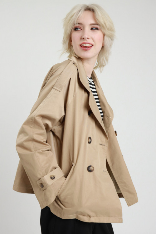 Kurzer zweireihiger Trenchcoat aus wasserdichter Baumwolle. 67 % bis 33 % nein