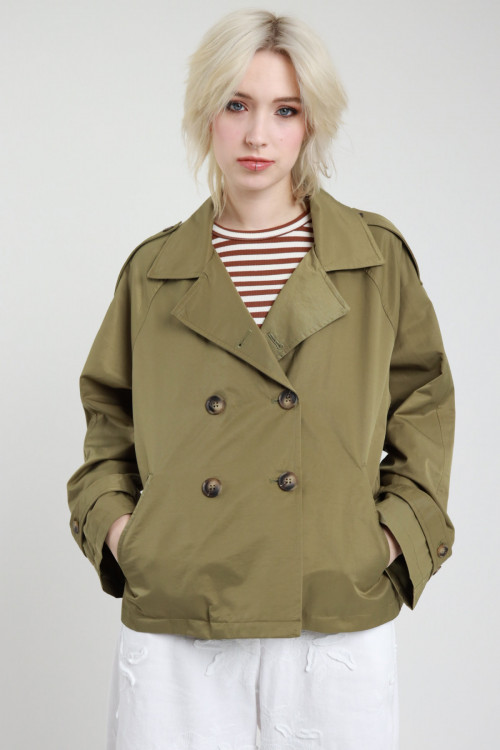 Kurzer zweireihiger Trenchcoat aus wasserdichter Baumwolle. 67 % bis 33 % nein