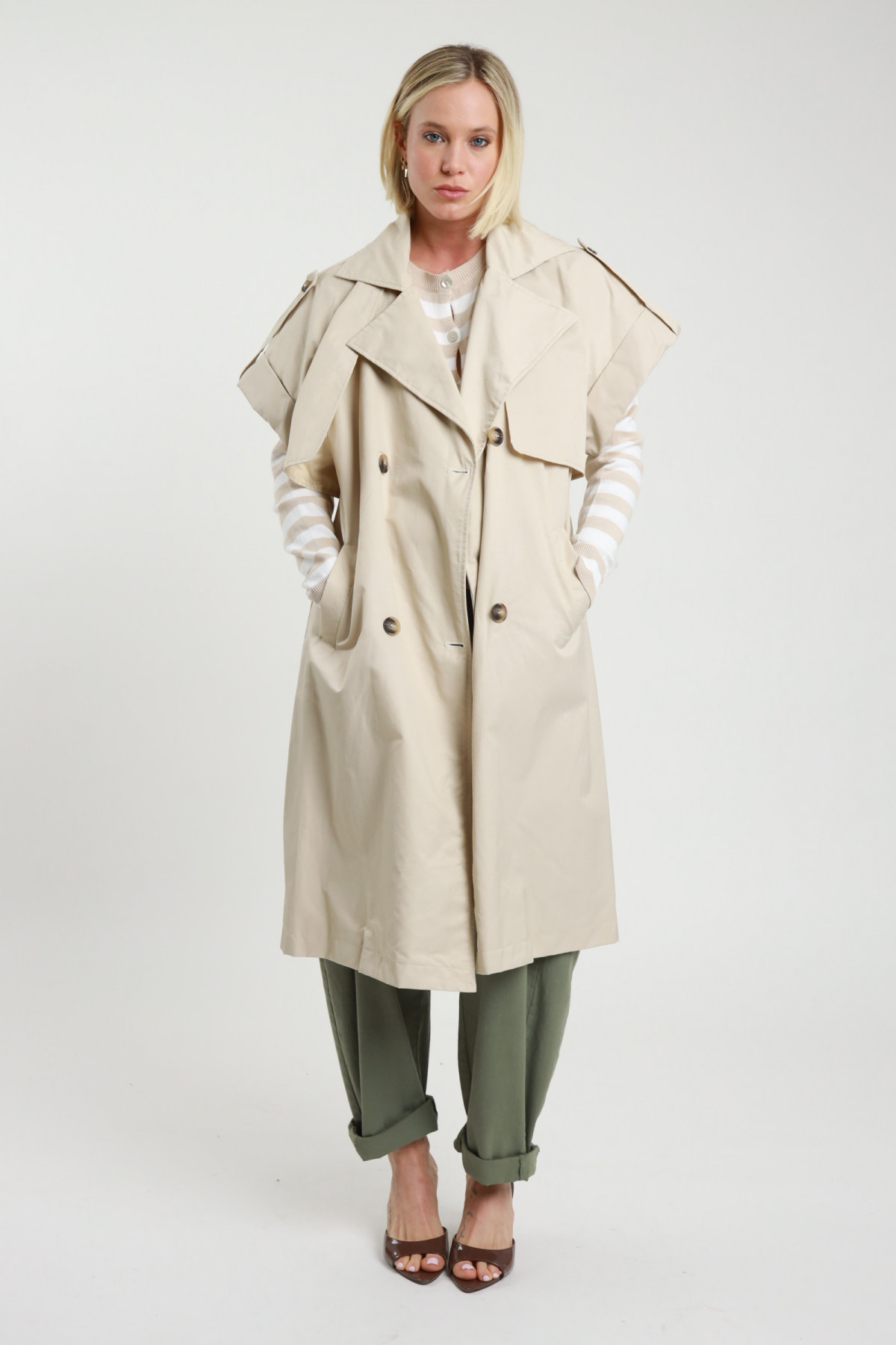 Wasserdichter, zweireihiger, ärmelloser Trenchcoat. 67 % bis 33 % nein