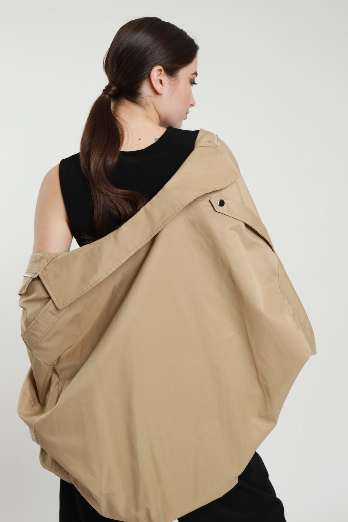 Kurzer Trenchcoat mit Fledermausärmeln. Reißverschluss + Reißverschluss-Abdeckklappe mit Druckknöpfen. Erstatteter Fonds. 67 % bis 33 % nein