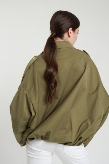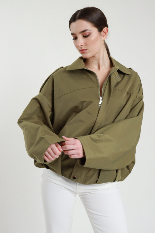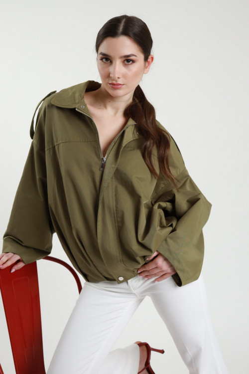 Kurzer Trenchcoat mit Fledermausärmeln. Reißverschluss + Reißverschluss-Abdeckklappe mit Druckknöpfen. Erstatteter Fonds. 67 % bis 33 % nein