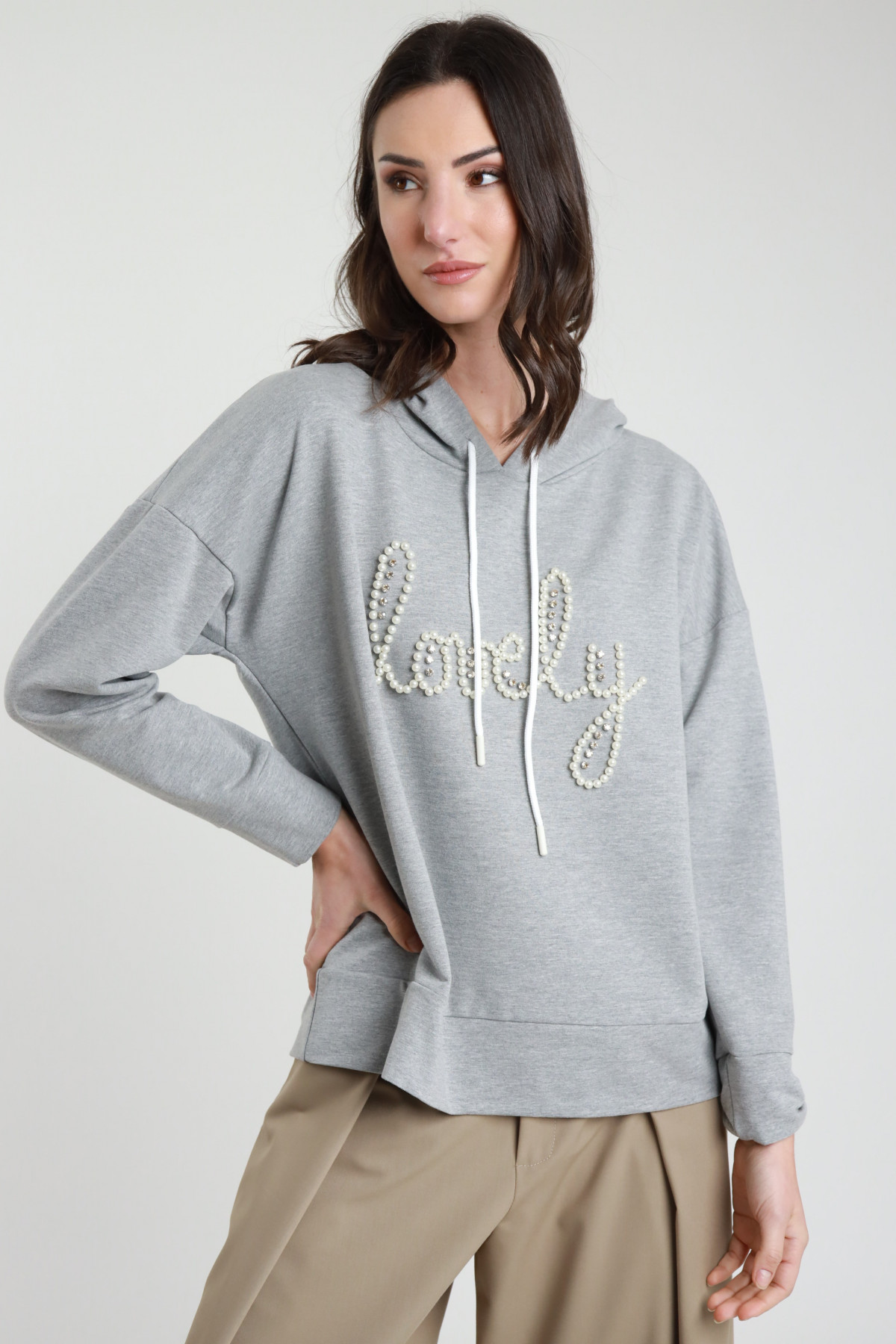 Felpa in Cotone con Cappuccio e Applicazione Perle e Strass "Lovely".
