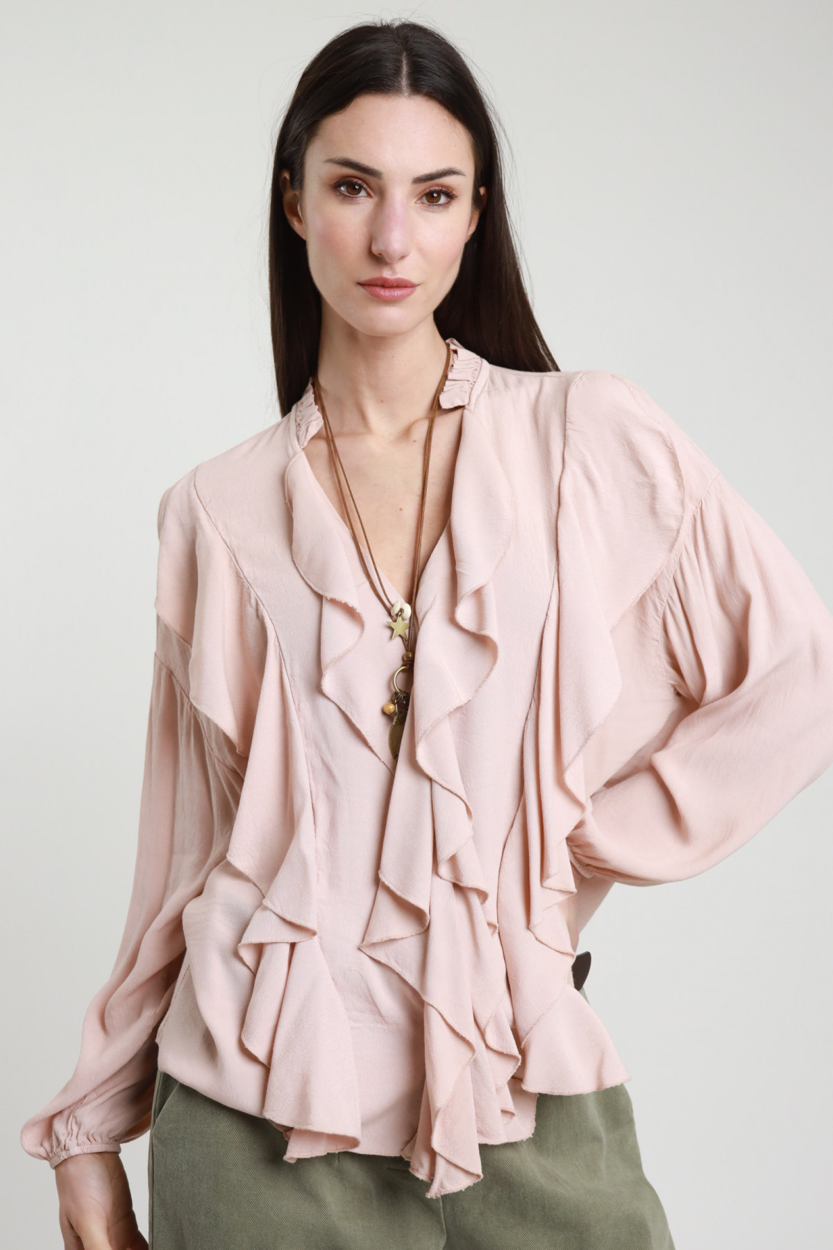 V-neck blouse with reds and lace on the front, puffed sleeves with elastic on the cuffs. 85%ly 15%pl