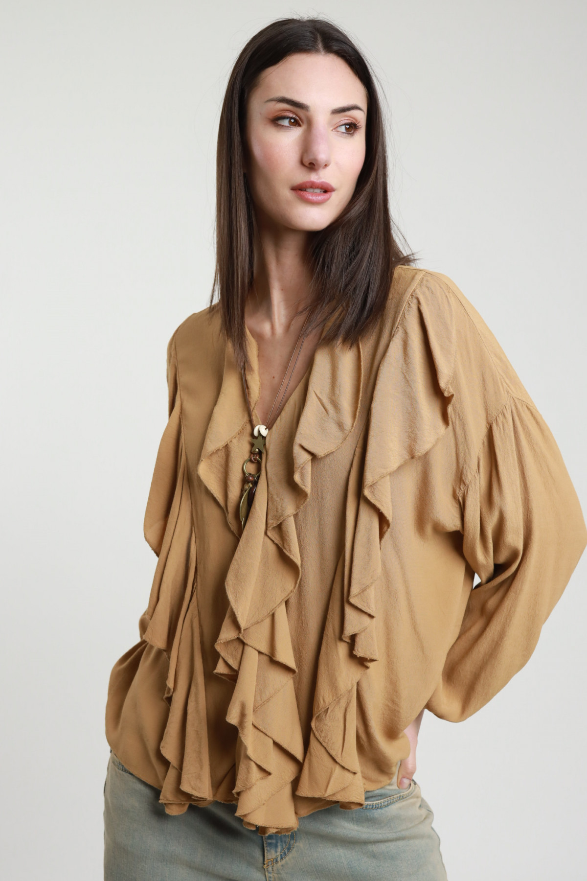V-neck blouse with reds and lace on the front, puffed sleeves with elastic on the cuffs. 85%ly 15%pl