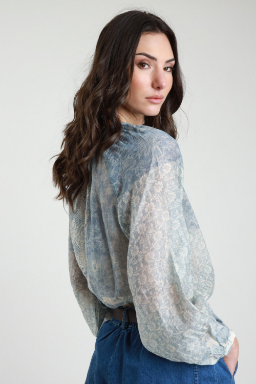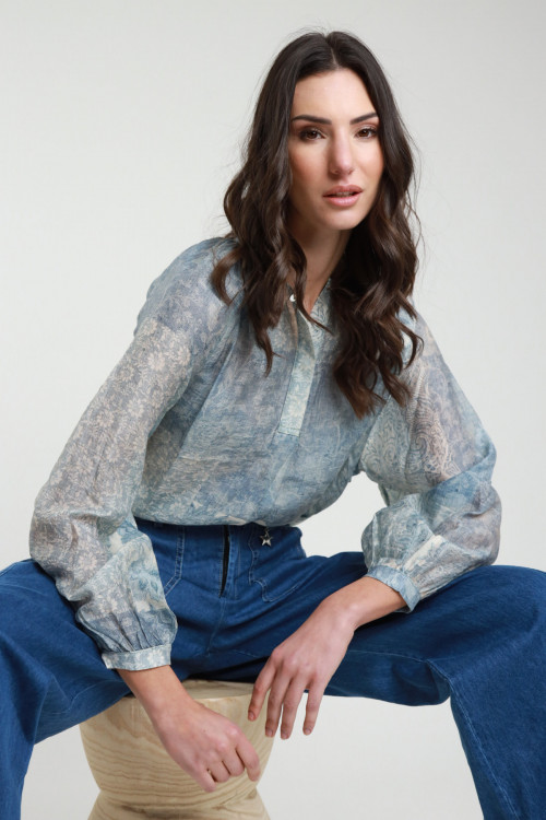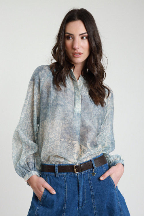 Gemustertes Hemd mit Stehkragen, halbem Knopfausschnitt, ohne Naht an der Schulter, Puffärmeln mit Manschette, weicher Passform. 75 % bis 25 % pa