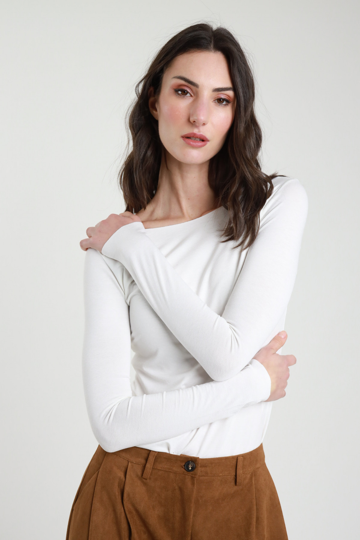 T-shirt Elasticizzata Maniche Lunghe con Scollo V a Righe.