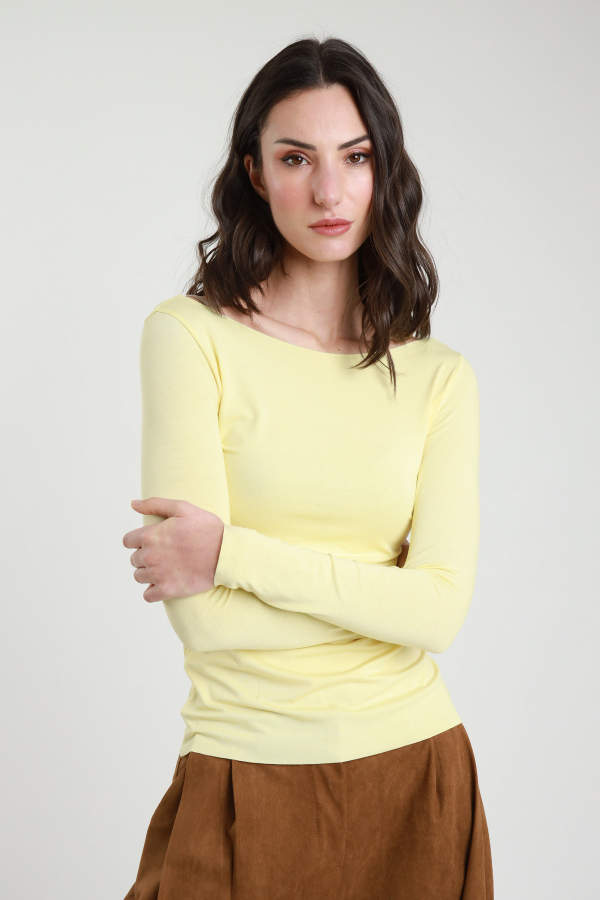 T-shirt Elasticizzata Maniche Lunghe con Scollo V a Righe.