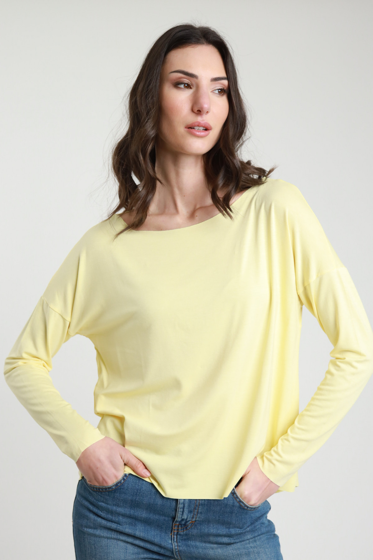 T-shirt Elasticizzata Maniche Lunghe, Scollo Barchetta a Righe.