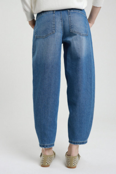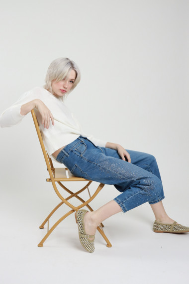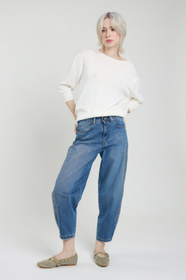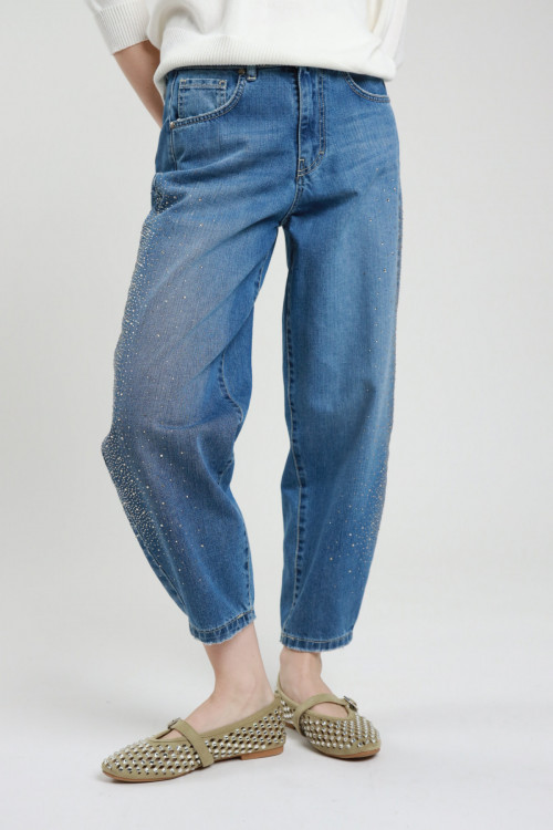 Jeansmodell „Banana“ mit an den Seiten applizierten Strasssteinen, Reißverschluss und Knopfverschluss. 100 % co