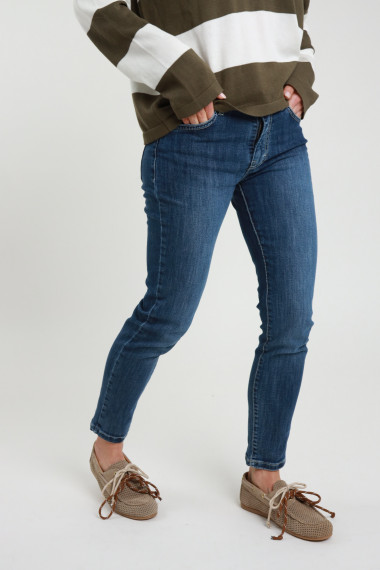 Jeans Elasticizzato Modello "Erika" Gamba Dritta, Vita Media, 5 Tasche, Chiusura Zip e Bottone.