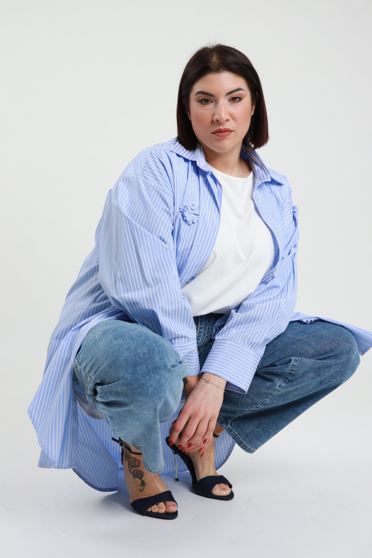 Camicia Over Lunga Gessata con Fiori Applicati - Linea Curvy Susy Star. 65%pl 35%co