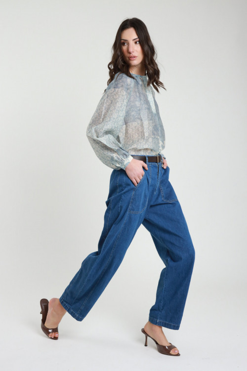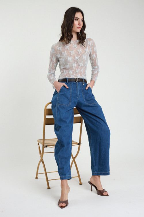 Jeans Wide Leg 5 Tasche a Vita Alta in Cotone Elasticizzato, Lavaggio Sabbiato.