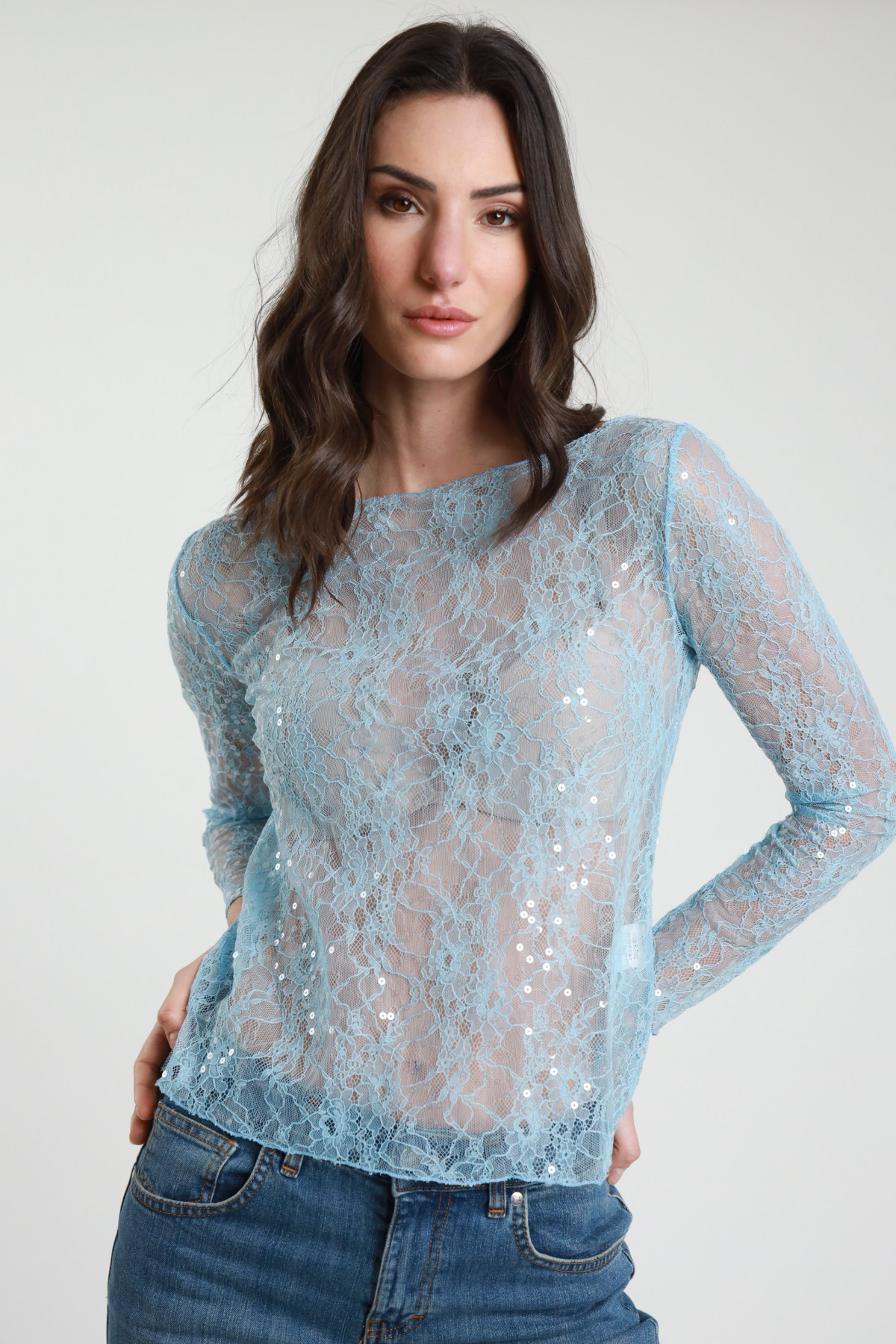 Langärmliges T-Shirt mit Rundhalsausschnitt aus Spitze und Pailletten. 100%ig