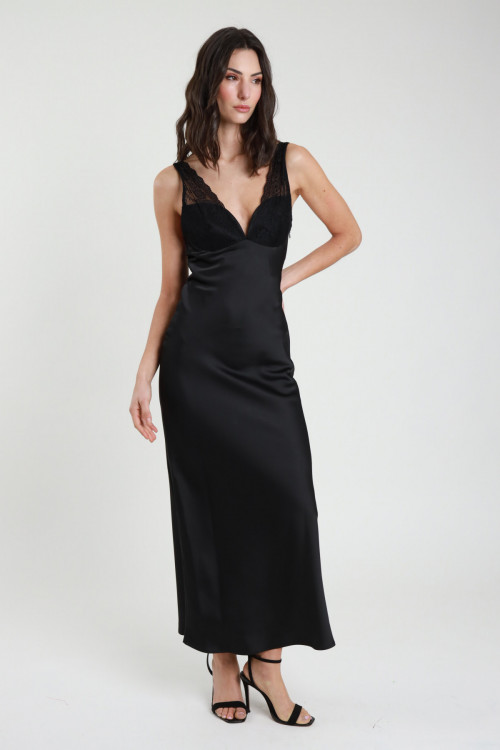 Langes Satinkleid mit Spitzenausschnitt und Polsterung an der Brust. 100%pl