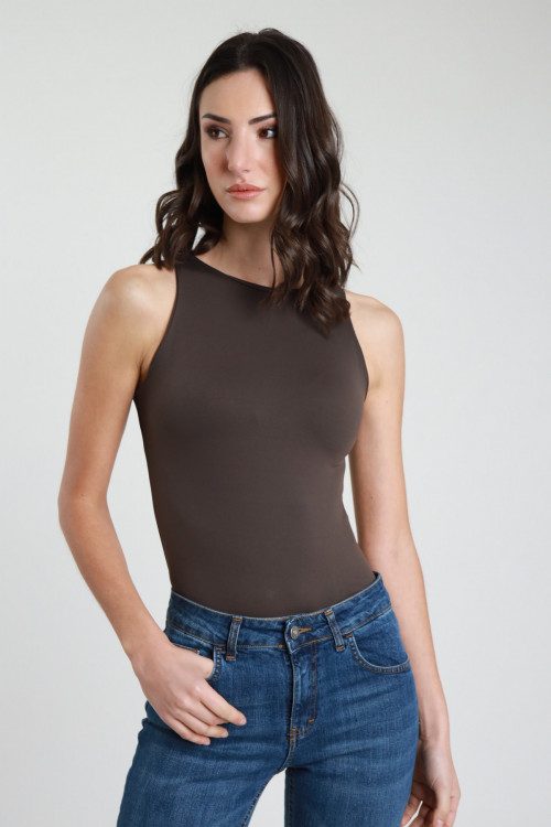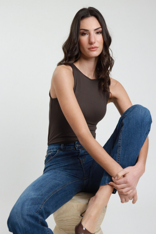 Canotta Canettata Con Scollo Tondo e Spalline Strette, Strass Apllicati.