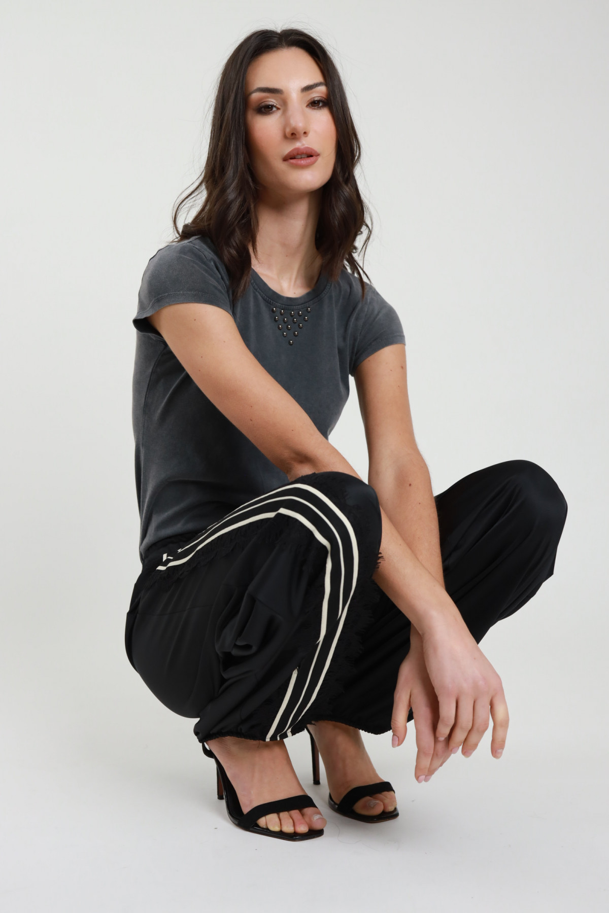 T-Shirt aus Stretch-Baumwolle mit ausgewaschenem Effekt, Rundhalsausschnitt und Nieten-Detail. 95 % CO 5 % Stück