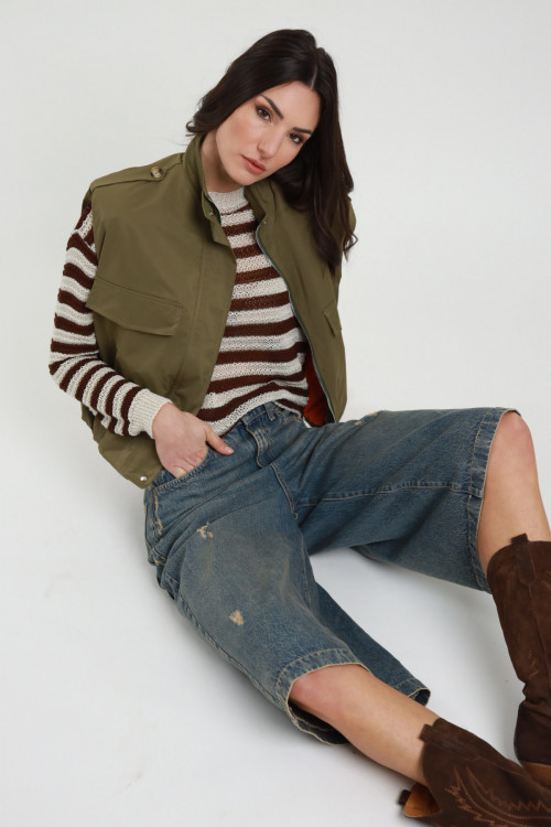 Ärmellose Bomberjacke mit großen Taschen und orangefarbener Innenseite, Reißverschluss und Clipknöpfen. 100%pl