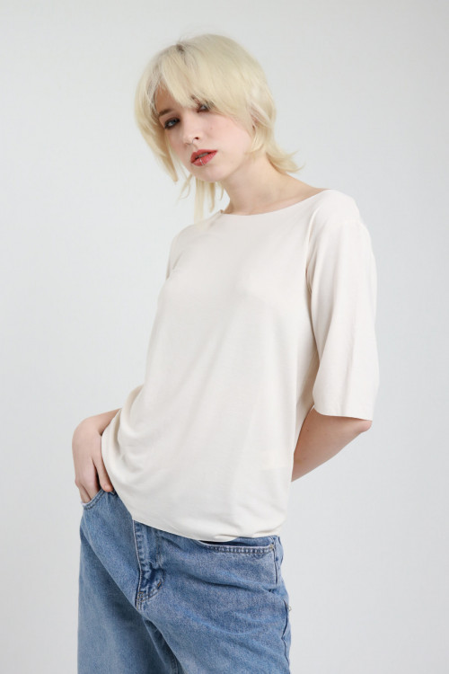 T-Shirt mit Rundhalsausschnitt aus Stretch-Viskose mit rohem Schnitt und halblangen Ärmeln. 94 %vi 6 %ea