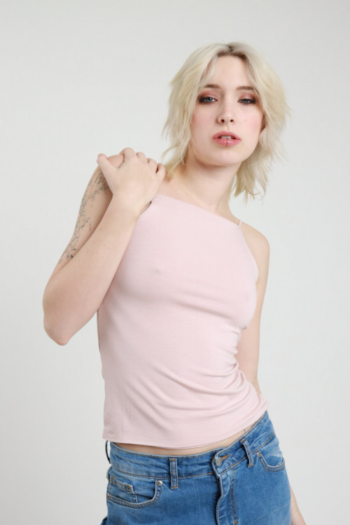 Oberteil aus Stretch-Viskose mit dünnem Schulterträger, hohem Ausschnitt und quadratischem Ausschnitt. 94 %vi 6 %ea