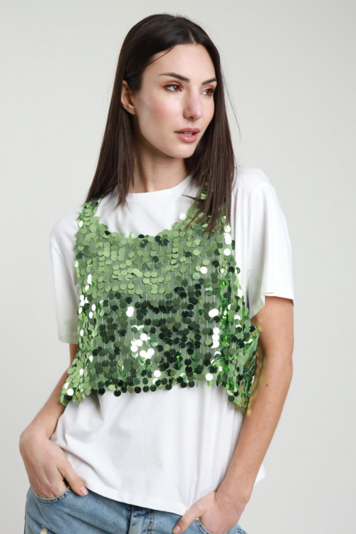 Felpa Girocollo Maniche Corte con Stampa e Borchiette Applicate.