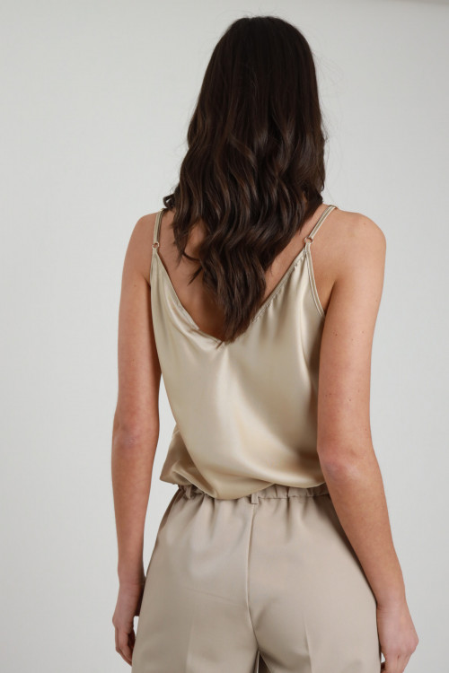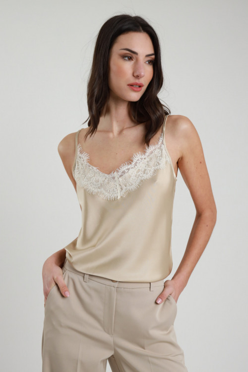 Top Satinato in Pizzo con Scollo a V e Spalline Sottili. Fondo Lungo Asimmetrico.