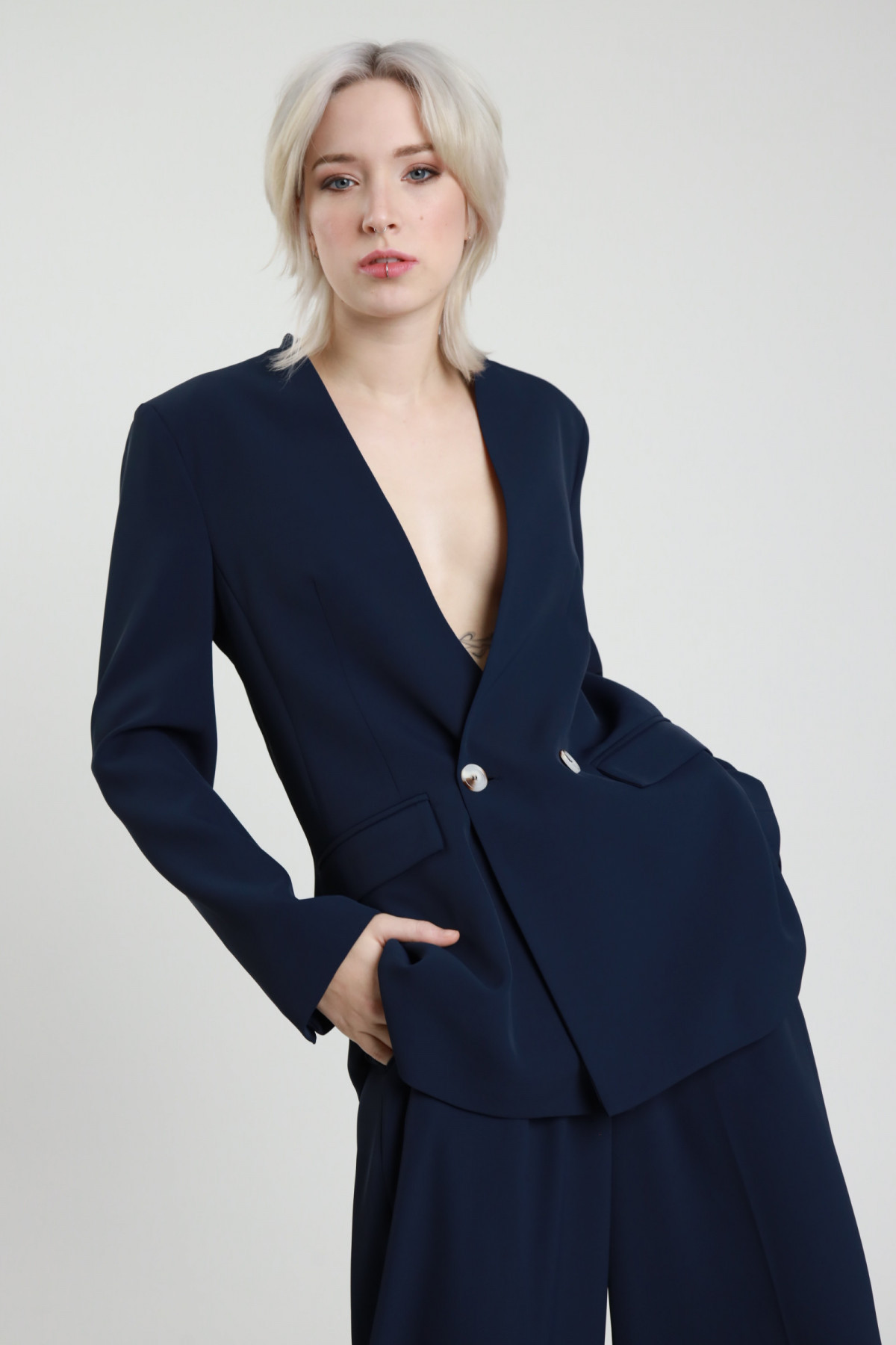 Zweireihiges Sakko ohne Revers, Vordertaschen mit Patte. 96%PL 4%EA + 98%PL 2%EA