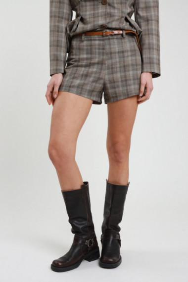Karierte Shorts mit Gürtelschlaufen und Gürtel, seitlichem Reißverschluss. 63 %pl 35 %vi 2 %ea